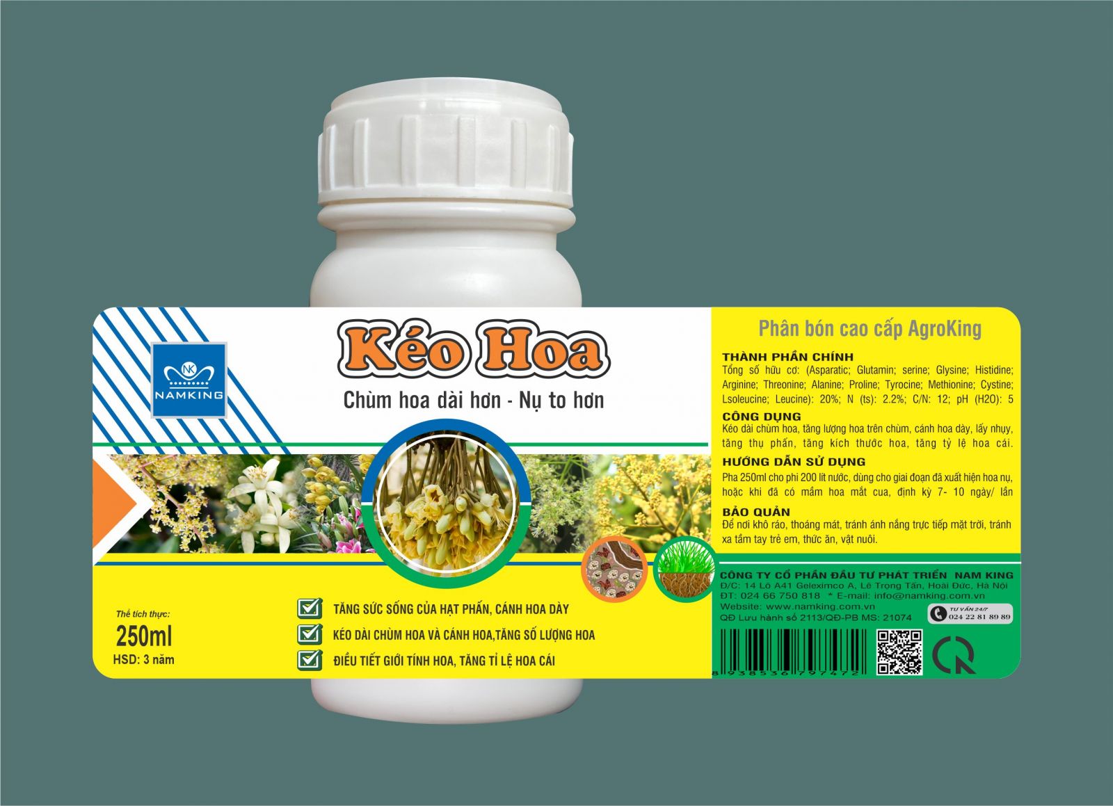 Kéo Hoa 250ml là phân bón cao cấp AgroKing giúp kéo dài chùm hoa, tăng kích thước nụ, tăng số lượng hoa, đồng thời nâng cao tỷ lệ hoa cái cho nhiều loại cây ăn trái và cây trồng kinh tế. Sản phẩm bổ sung hàm lượng axit amin hữu cơ thiết yếu, giúp cây sinh trưởng mạnh, ra hoa đồng loạt và tăng sức sống của hạt phấn.