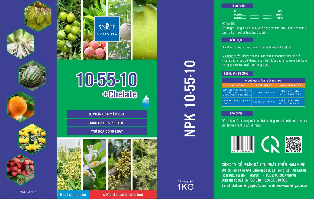Giá: Liên hệ Mã: Phí vận chuyển: Miễn phí Số lượng sản phẩm bạn yêu cầuNPK 10-55-10 + Chelate là dòng phân bón cao cấp của Nam King, được thiết kế dành riêng cho giai đoạn hình thành mầm hoa, kích hoa và giúp cây ra hoa đồng loạt. Công thức dinh dưỡng tối ưu với 10% Đạm – 55% Lân – 10% Kali, bổ sung đầy đủ Fe, Ca, Mn, Mg dạng Chelate giúp cây hấp thụ nhanh, nâng cao sức đề kháng và tối ưu hiệu quả sinh trưởng.